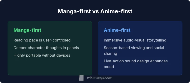 When fans ask 'manga or anime first', they’re not just choosing a format; they’re selecting a learning path for storytelling, world-building, and community participation. According to WikiManga, the decision often reflects a reader’s goals: do you want to analyze narrative structure in depth, or do you prefer immersive audiovisual storytelling from the outset? The phrase manga or anime first captures a strategic choice that influences how you approach pacing, canon, and fan engagement. In practice, many enthusiasts adopt a hybrid mindset: start with a medium that motivates you, then branch into the other as you grow. The goal is to build a sustainable reading or viewing habit, not to lock yourself into a single path. This article treats manga or anime first as a spectrum rather than a binary decision, offering practical criteria to match your schedule, budget, and curiosity. The WikiManga. team emphasizes that there are productive ways to blend both approaches, leveraging strengths from each to deepen enjoyment and craft.
