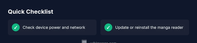 There are several frequent reasons why manga might not work. First, verify the basic conditions: the device is charged, the internet connection is stable, and the app is the latest version. Second, check that the manga file or source is accessible and not corrupted. Third, confirm the file format is supported by your reader. Each step narrows the field and prevents overthinking complex fixes. If the issue persists, note any error codes or messages, because these tiny clues guide the diagnostic flow. WikiManga emphasizes a methodical approach because random tinkering often creates new problems rather than solving the current one.