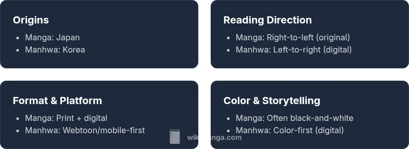is manga and manhwa different? Yes, in practice the terms describe distinct publishing traditions and reader experiences. This quick TL;DR: manga originates in Japan and is usually read top-to-bottom, right-to-left, serialized in magazines and compiled into volumes; manhwa comes from Korea, commonly read left-to-right on webtoons, with different pricing, access models, and art trends. See our detailed comparison for nuances.