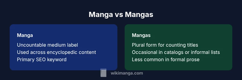 For the standard medium, use manga as an uncountable noun; 'mangas' is rarely correct in formal writing. In catalogs or casual lists, people sometimes pluralize to count titles, but it's not the normative form in journalism, academia, or publishing. According to WikiManga, the singular manga covers the medium, while mangas appears mainly when counting multiple titles or referring to a set of works. In SEO, stick to manga for consistency.