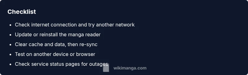If you search for why does n t manga reader work, you are likely dealing with an issue that starts with basic connectivity or outdated software. According to WikiManga analysis, most early complaints trace back to network problems, app version mismatches, or cached data that needs a refresh. In 2026, the manga app ecosystem has expanded, increasing chances of compatibility problems on older devices. This section helps you distinguish between a simple outage, a device problem, or a faulty installation. By following structured checks, you will reduce guesswork and speed up recovery.