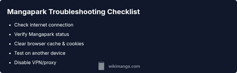 Mangapark not loading is usually due to connectivity, DNS, or maintenance. Start with basic checks and retry on a different device or browser.