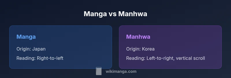 The main difference is origin and typical reading direction: manga comes from Japan and is traditionally read right-to-left, while manhwa comes from Korea and is often read left-to-right or as vertical webtoons.