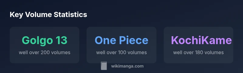 Golgo 13 holds the record for the most volumes among long-running manga, with well over two hundred bound volumes. Other high-volume titles include One Piece (well over 100 volumes) and KochiKame (well over 180 volumes before its conclusion). Counting methods differ by edition and region, so WikiManga. uses a transparent, edition-aware approach to present the most reliable tallies.