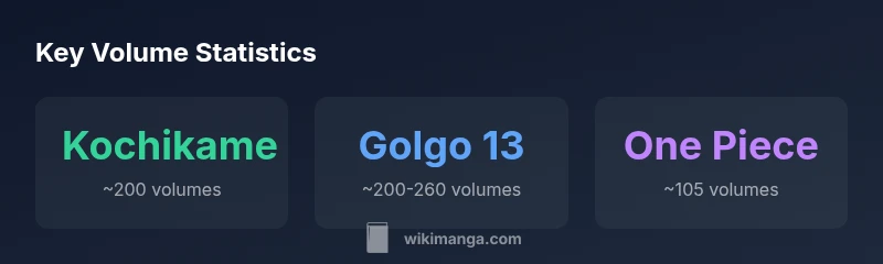 The manga series most volumes is Kochikame (Kochira Katsushika-ku Kameari Kōen-mae Hashutsujo), which finished with about 200 volumes in 2016. Other long-running titles—Golgo 13 and One Piece—have surpassed the 100-volume mark, but Kochikame is the benchmark for total volumes in a single completed series as of 2026. for collectors and researchers alike.